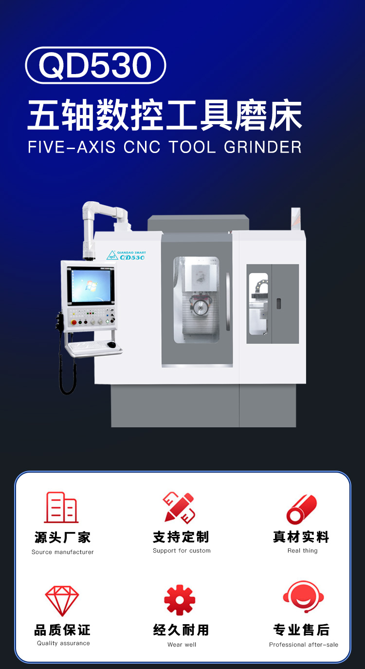 QD530是千島公司新研發(fā)的五軸五聯動數控工具磨床,是一款高性價比刀具磨床,適用于生產或修磨各類銑削類刀具、鉆削類刀具、成形刀具等。