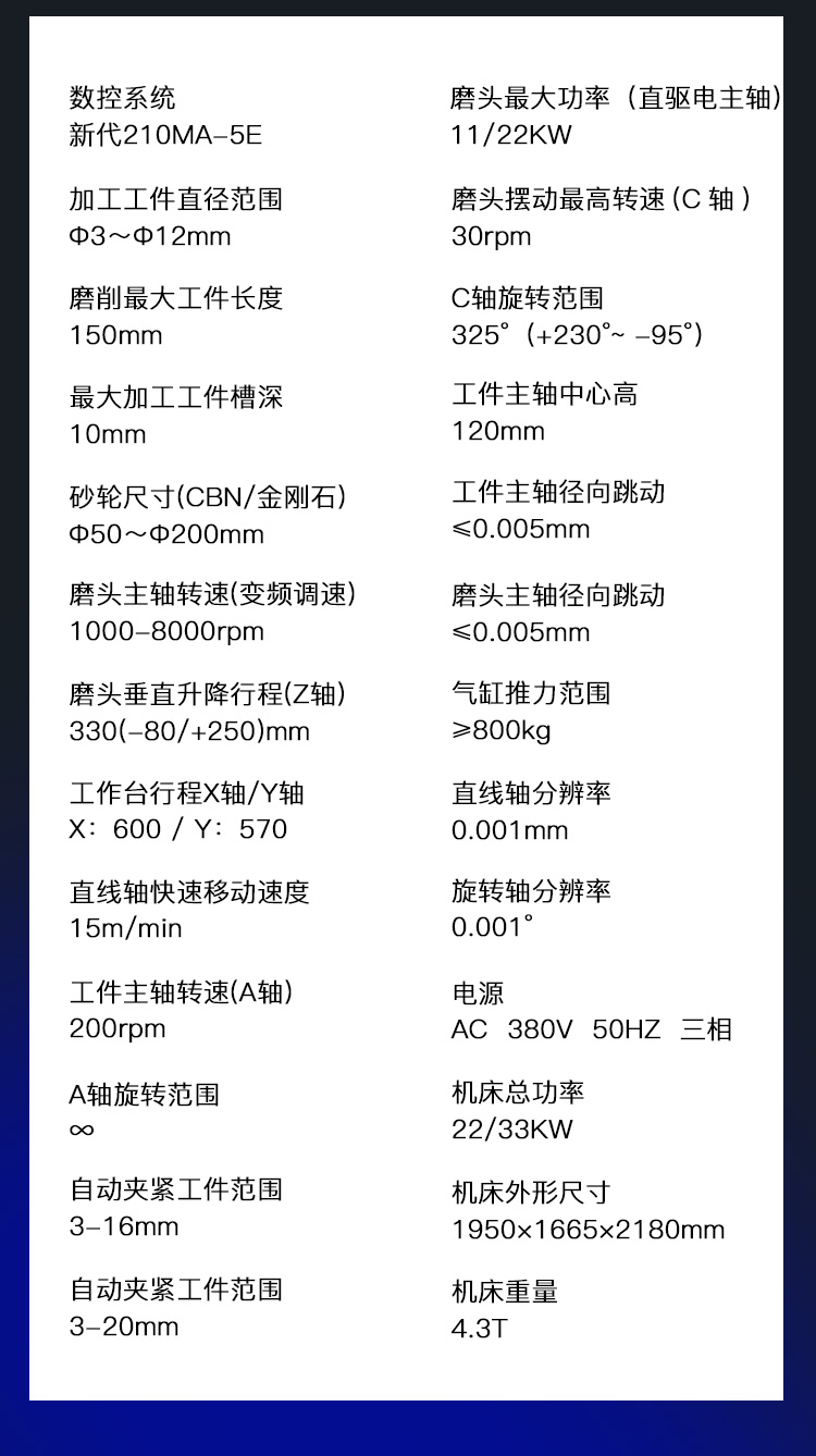 機床采用高精度、同步直驅變頻電主軸,主軸有兩組砂輪法蘭,每組法蘭可同時裝2~4片砂輪,根據磨削工藝,砂輪組換位快捷,可充分滿足各種刀具磨削需求。